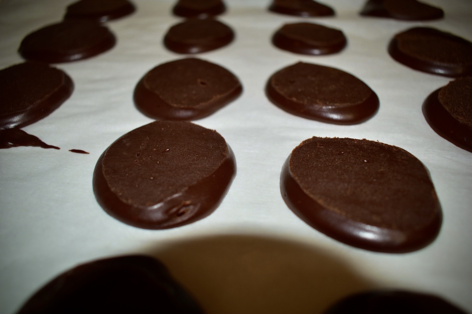 - Once firm, scoop teaspoon-sized mounds of ganache onto a parchment-lined plate and freeze while you make the cookie dough