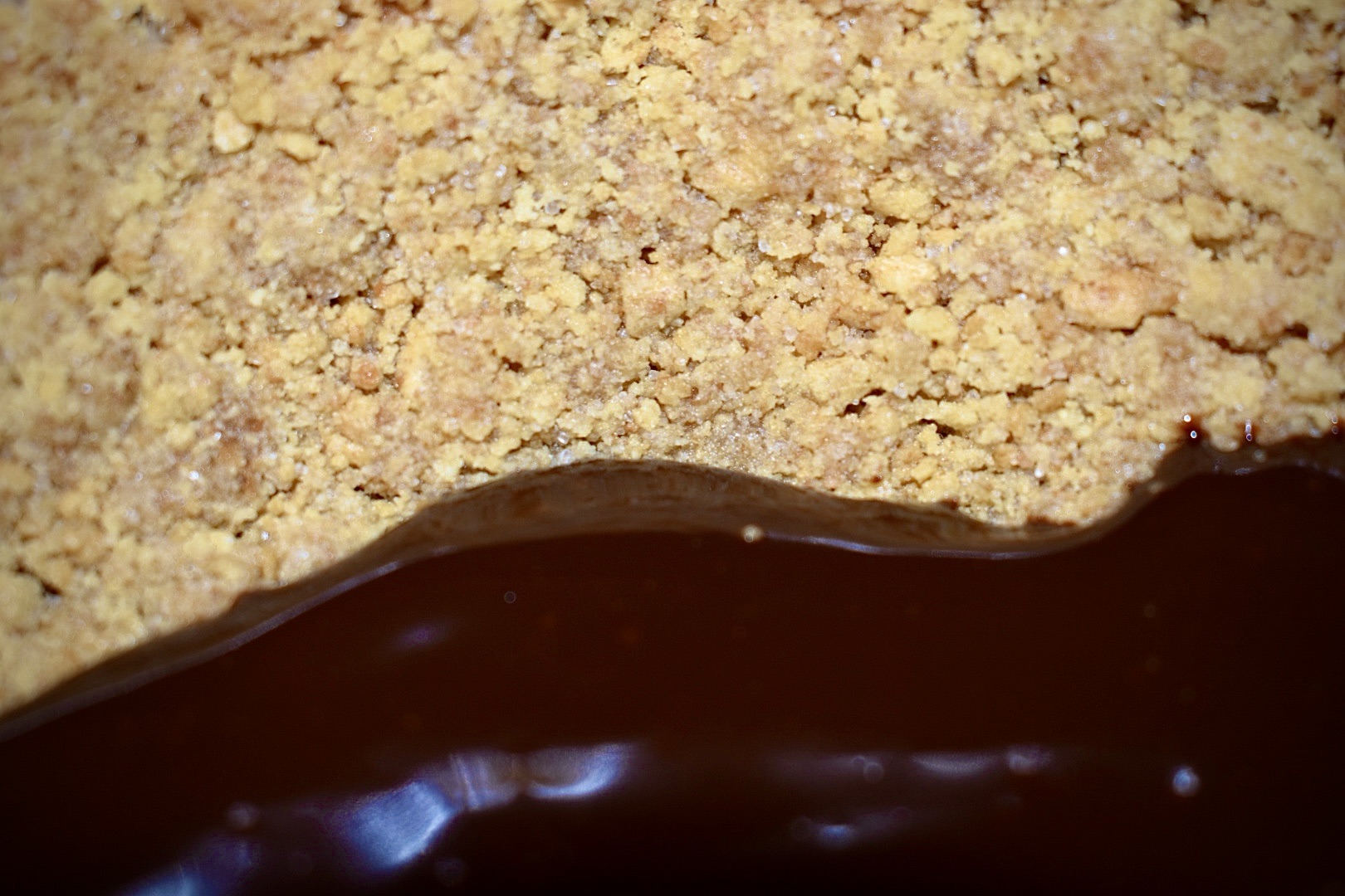 - Stir in 6 tbsp melted, unsalted butter until it feels like wet sand.