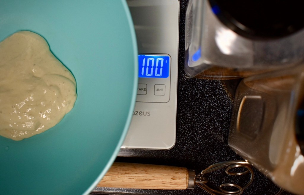 - Feed your sourdough starter: Discard half, then feed with 1 cup all-purpose flour and ½–¾ cup water until it’s the consistency of thick muffin batter.