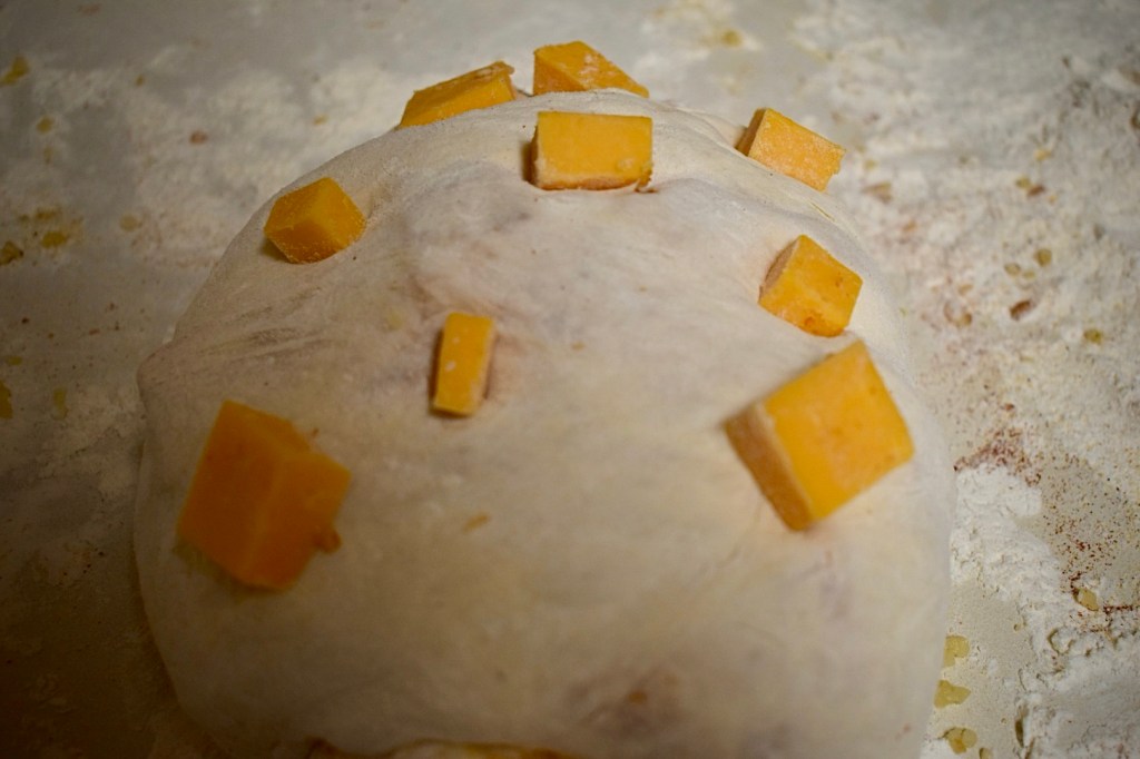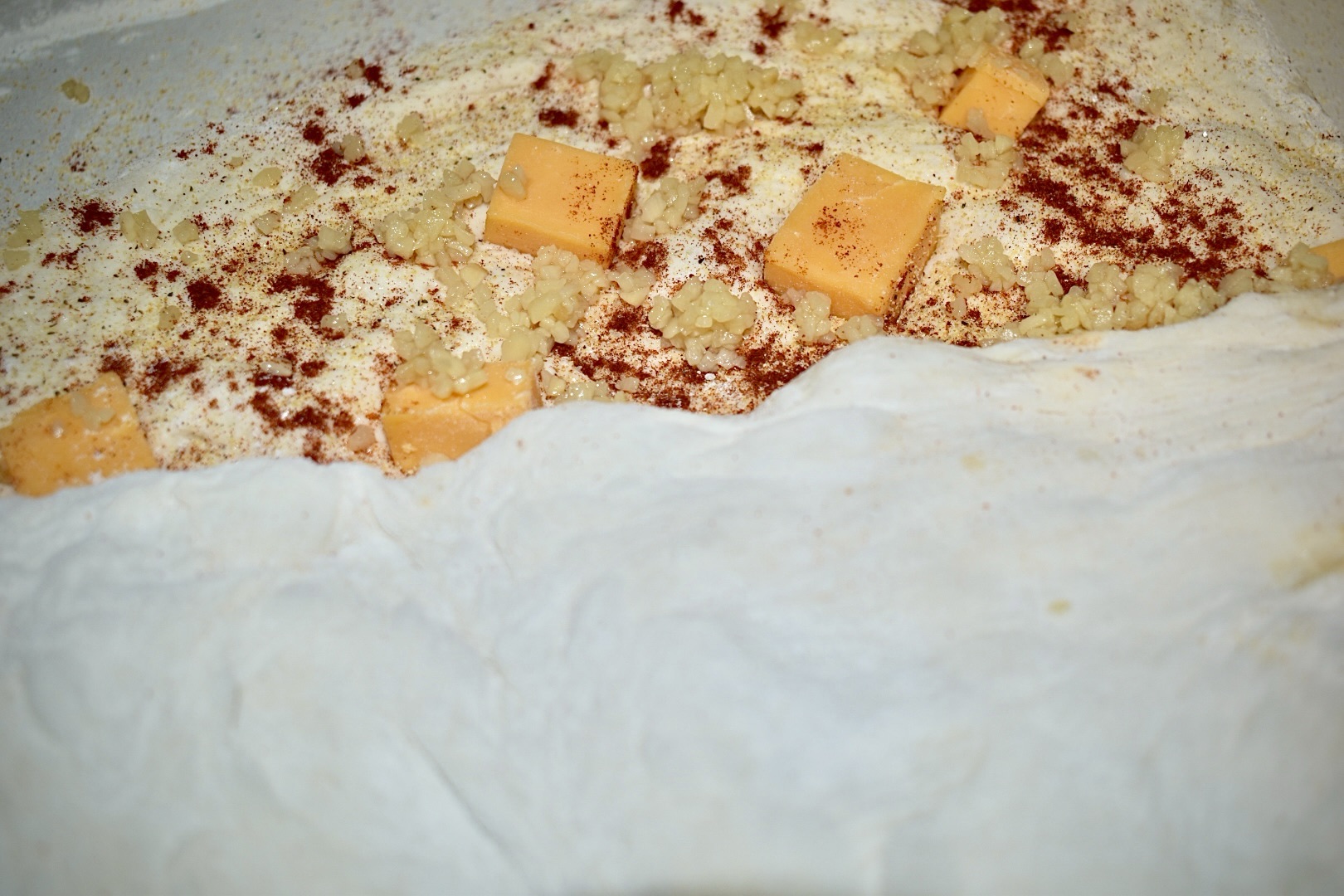 - (Optional) If you’d like toppings like cheddar, herbs, jalapeños… sprinkle them over the top now and lightly press them in — this keeps them visible and toasty after baking.
