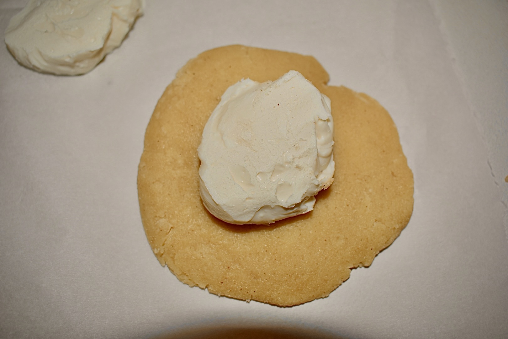 Scoop about 2 tbsp (40 g) dough, flatten it into a circle, and place a frozen cheesecake ball in the center.