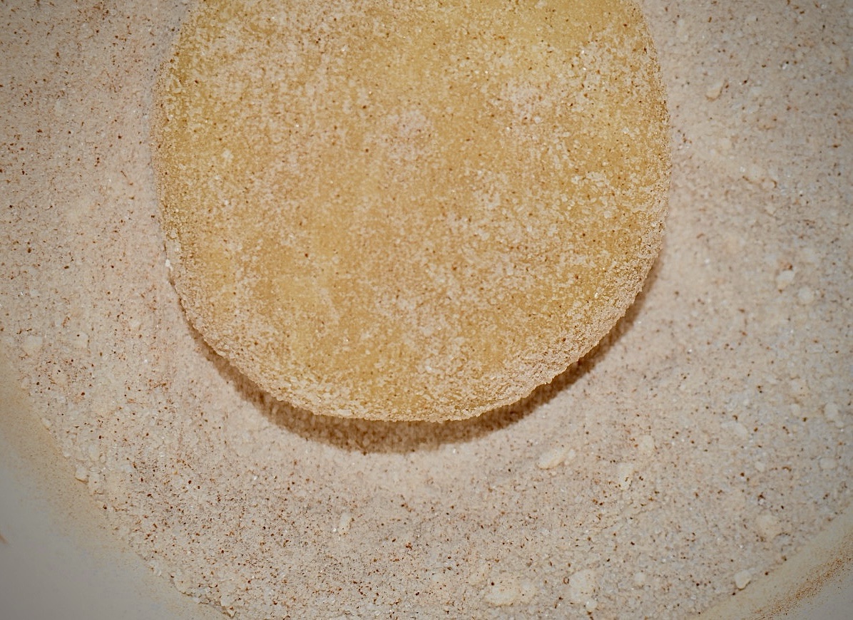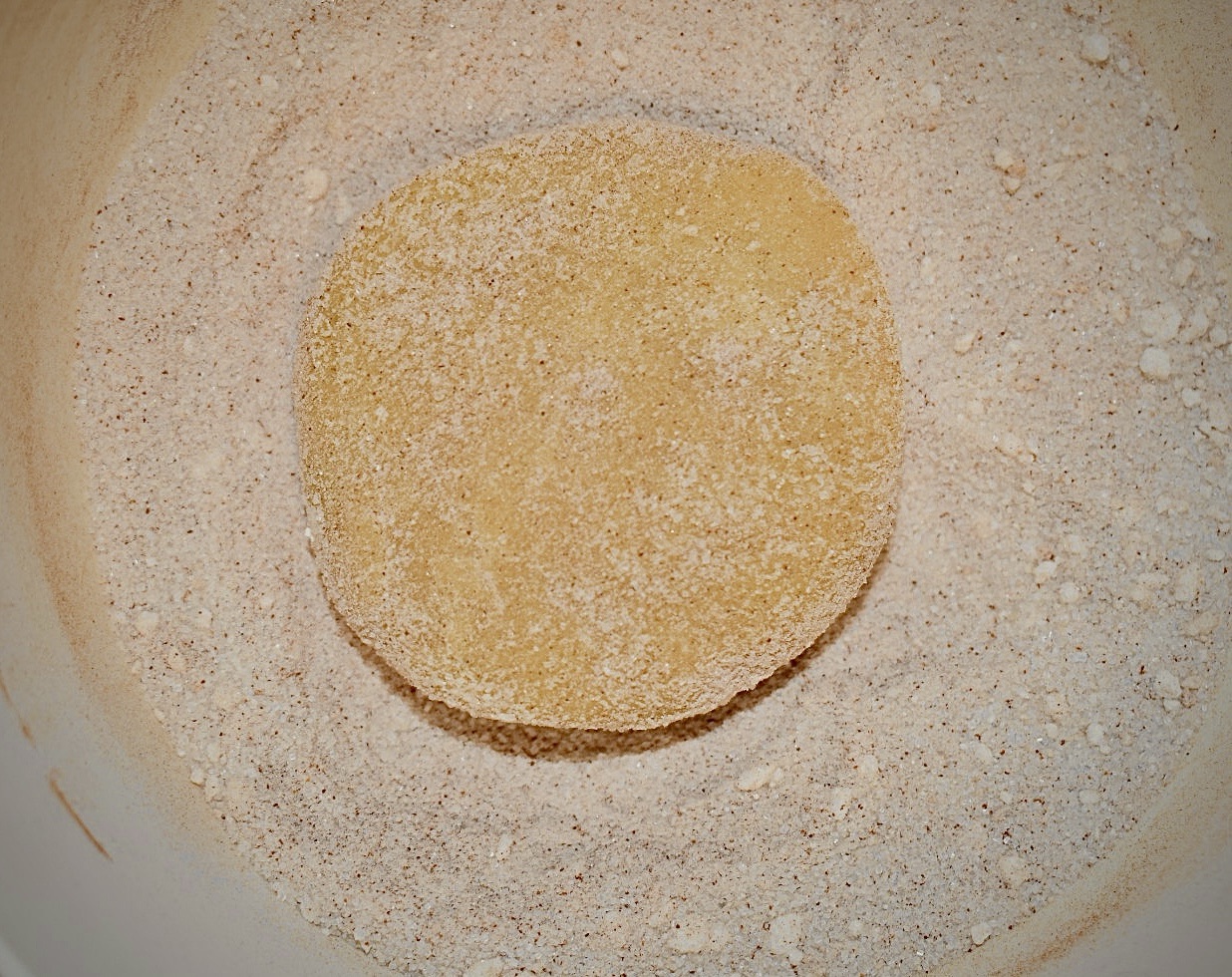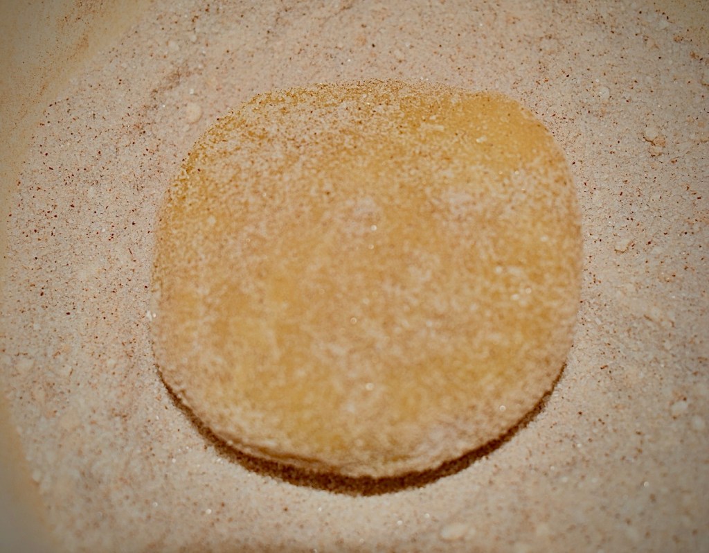 Wrap the dough around the filling, seal the edges, and roll in cinnamon-sugar